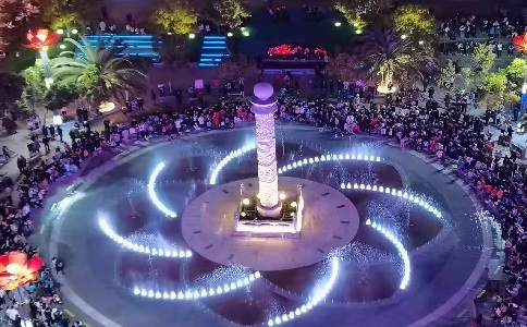 雙龍廣場的音樂噴泉隨著節奏婀娜綻放,音樂的旋律縈繞在光影中,帶來震撼而又夢幻的視覺沖擊